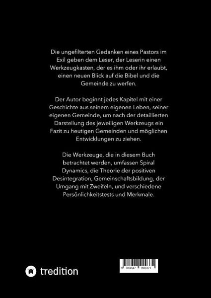 Die ungefilterten Gedanken eines Pastors im Exil geben dem Leser, der Leserin einen Werkzeugkasten, der es ihm oder ihr erlaubt, einen neuen Blick auf die Bibel und die Gemeinde zu werfen.Der Autor beginnt jedes Kapitel mit einer Geschichte aus seinem eigenen Leben, seiner eigenen Gemeinde, um nach der detaillierten Darstellung des jeweiligen Werkzeugs ein Fazit zu heutigen Gemeinden und möglichen Entwicklungen zu ziehen.Die Werkzeuge, die in diesem Buch betrachtet werden, umfassen Spiral Dynamics, die Theorie der positiven Desintegration, Gemeinschaftsbildung, der Umgang mit Zweifeln, und verschiedene Persönlichkeitstests und Merkmale.