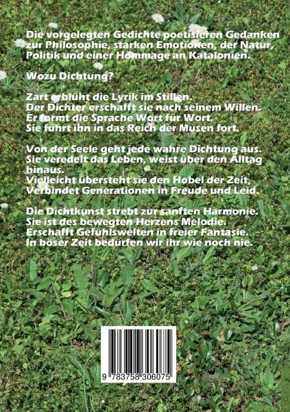 Die vorgelegten Gedichte poetisieren Gedankenzur Philosophie, starken Emotionen, der Natur, Politik und eine Hommage an Katalonien.Wozu Dichtung?Zart erblüht die Lyrik im Stillen.Der Dichter erschafft sie nach seinem Willen.Er formt die Sprache Wort für Wort.Sie führt ihn in das Reich der Musen fort.Von der Seele geht jede wahre Dichtung aus.Sie veredelt das Leben, weist über den Alltag hinaus.Vielleicht übersteht sie den Hobel der Zeit,Verbindet Generationen in Freude und Leid.Die Dichtkunst strebt zur sanften Harmonie.Sie ist des bewegten Herzens Melodie.Erschafft Gefühlswelten in freier Fantasie.In böser Zeit bedürfen wir ihr wie noch nie.