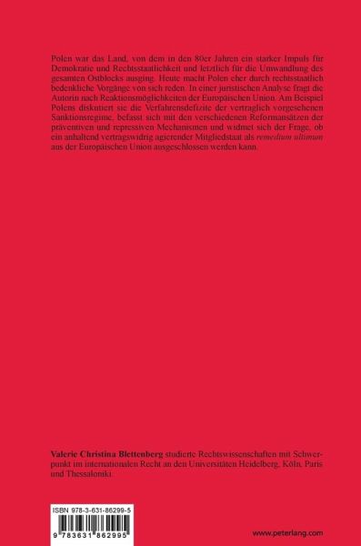 Polen war das Land, von dem in den 80er Jahren ein starker Impuls für Demokratie und Rechtsstaatlichkeit und letztlich für die Umwandlung des gesamten Ostblocks ausging. Heute macht Polen eher durch rechtsstaatlich bedenklich Vorgänge von sich reden. In einer juristischen Analyse fragt die Autorin nach Reaktionsmöglichkeiten der Europäischen Union. Am Beispiel Polens diskutiert sie die Verfahrensdefizite der vertraglich vorgesehenen Sanktionsregime, befasst sich mit den verschiedenen Reformansätzen der präventiven und repressiven Mechanismen und widmet sich der Frage, ob ein anhaltend vertragswidrig agierender Mitgliedstaat als remedium ultimum aus der Europäischen Union ausgeschlossen werden kann.