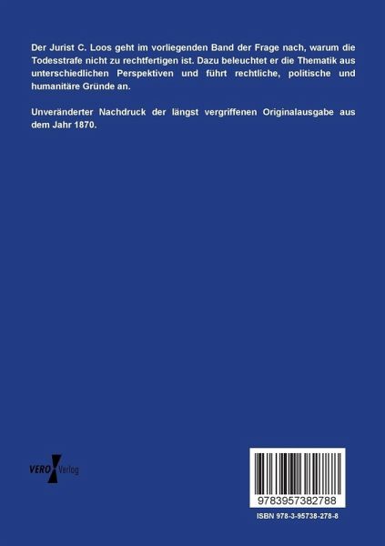 Der Jurist C. Loos geht im vorliegenden Band der Frage nach, warum die Todesstrafe nicht zu rechtfertigen ist. Dazu beleuchtet er die Thematik aus unterschiedlichen Perspektiven und führt rechtliche, politische und humanitäre Gründe an.