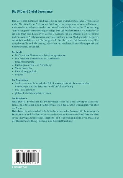 Die Vereinten Nationen sind heute keine rein zwischenstaatliche Organisation mehr. Nichtstaatliche Akteure wie Nichtregierungsorganisationen und Unternehmen werden zunehmend an den dort stattfindenden Prozessen der Normsetzung, -umsetzung und -durchsetzung beteiligt. Das Lehrbuch führt in die Arbeit der UN ein und trägt dem Einzug von Global Governance in die Organisation Rechnung, indem es einen Analyserahmen zur Untersuchung neuer Modi globalen Regierens entwickelt und diesen auf fünf ausgewählte Sachbereiche (Friedenssicherung, Rüstungskontrolle und Abrüstung, Menschenrechtsschutz, Entwicklungspolitik und Umweltpolitik) anwendet.