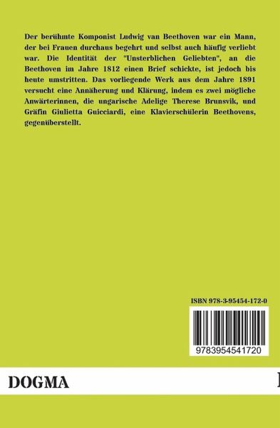 Der berühmte Komponist Ludwig van Beethoven war ein Mann, der bei Frauen durchaus begehrt und selbst auch häufig verliebt war. Die Identität der "Unsterblichen Geliebten", an die Beethoven im Jahre 1812 einen Brief schickte, ist jedoch bis heute umstritten. Das vorliegende Werk aus dem Jahre 1891 versucht eine Annäherung und Klärung, indem es zwei mögliche Anwärterinnen, die ungarische Adelige Therese Brunsvik, und Gräfin Giulietta Guicciardi, eine Klavierschülerin Beethovens, gegenüberstellt.