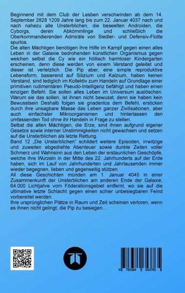 Beginnend mit dem Club der Lesben verschwinden ab dem 14. September 2828 1209 Jahre lang bis zum 22. Januar 4037 nach und nach nahezu alle Unsterblichen, die beseelten Androiden, die Cyborgs, deren Abkömmlinge und schließlich die Oberkommandierenden Admiräle von Siedler- und Defensiv-Flotte spurlos.Die alten Mächtigen benötigen ihre Hilfe im Kampf gegen einen alles Leben in der Galaxie bedrohenden künstlichen Organismus gegen welchen selbst die Cy wie ein höllisch harmloser Kindergarten erscheinen, denn diese werden von einem Verstand geleitet und dieser ist verletzlich. Die Pip aber, eine simple reproduktive Lebensform, basierend auf Silizium und Kalzium, haben keinen Verstand, sind lediglich im Kollektiv zum Handeln auf Grundlage einer primitiven rudimentären Pseudo-Intelligenz befähigt und haben einen einzigen Befehl. Sie sollen alles Leben im Universum auslöschen. Warum sie das sollen, ist ihnen nicht bewusst, denn sie haben kein Bewusstsein Deshalb folgen sie gnadenlos dem Befehl, ersticken durch ihre unsagbare Masse das Leben ganzer Zivilisationen, aber auch einfachster Mikroorganismen und hinterlassen den umfassenden Tod ohne ihr Handeln in Frage zu stellen.Selbst die alten Mächtigen, die Erze, sind ihnen aufgrund eigener Gesetze sowie interner Unstimmigkeiten nicht gewachsen und setzen auf die Unsterblichen als letzte Rettung.Band 12 "Die Unsterblichen" schildert weitere Episoden, irrwitzige und zuweilen abgedrehte Abenteuer sowie dunkle Zeiten voller Schmerz und Wahnsinn aus den Leben der erstaunlichen Geschöpfe, welche ihre Wurzeln in der Mitte des 22. Jahrhunderts auf der Erde haben, sich im Lauf von Jahrhunderten und Jahrtausenden immer wieder begegnen, lieben und gegenseitig stützen.All diese Geschichten münden am 1. Januar 4045 in einer Zusammenkunft der Unsterblichen am anderen Ende der Galaxie, 64.000 Lichtjahre vom Föderationsgebiet entfernt, wo sie auf die ultimative letzte Schlacht gegen einen schier unbesiegbaren Feind vorbereitet werden.Ihre ursprünglichen Plätze in Raum und Zeit scheinen verloren, wenn es ihnen nicht gelingt, die Pip zu besiegen...