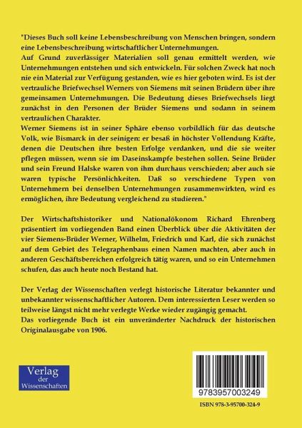 Der Wirtschaftshistoriker und Nationalökonom Richard Ehrenberg präsentiert im vorliegenden Band einen Überblick über die Aktivitäten der vier Siemens-Brüder Werner, Wilhelm, Friedrich und Karl, die sich zunächst auf dem Gebiet des Telegraphenbaus einen Namen machten, aber auch in anderen Geschäftsbereichen erfolgreich tätig waren, und so ein Unternehmen schufen, das auch heute noch Bestand hat.
