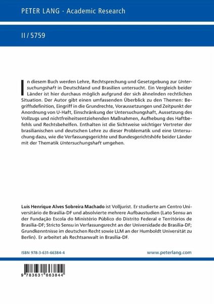 In diesem Buch werden Lehre, Rechtsprechung und Gesetzgebung zur Untersuchungshaft in Deutschland und Brasilien untersucht. Ein Vergleich beider Länder ist hier durchaus möglich aufgrund der sich ähnelnden rechtlichen Situation. Der Autor gibt einen umfassenden Überblick zu den Themen: Begriffsdefinition, Eingriff in die Grundrechte, Voraussetzungen und Zeitpunkt der Anordnung von U-Haft, Einschränkung der Untersuchungshaft, Aussetzung des Vollzugs und nichtfreiheitsentziehenden Maßnahmen, Aufhebung des Haftbefehls und Rechtsbehelfen. Enthalten ist die Sichtweise wichtiger Vertreter der brasilianischen und deutschen Lehre zu dieser Problematik und eine Untersuchung dazu, wie die Verfassungsgerichte und Bundesgerichtshöfe beider Länder mit der Thematik Untersuchungshaft umgehen.
