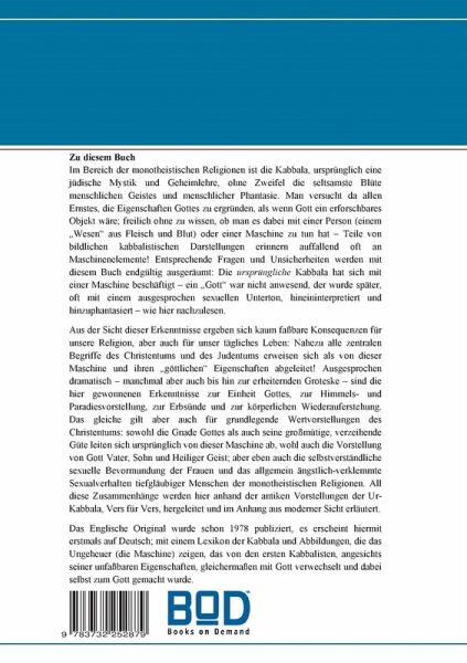 Im Bereich der monotheistischen Religionen ist die Kabbala, ursprünglich eine jüdische Mystik und Geheimlehre, ohne Zweifel die seltsamste Blüte menschlichen Geistes und menschlicher Phantasie. Man versucht da allen Ernstes, die Eigenschaften Gottes zu ergründen, als wenn Gott ein erforschbares Objekt wäre; freilich ohne zu wissen, ob man es dabei mit einer Person (einem "Wesen" aus Fleisch und Blut) oder einer Maschine zu tun hat - Teile von bildlichen kabbalistischen Darstellungen erinnern auffallend oft an Maschinenelemente! Entsprechende Fragen und Unsicherheiten werden mit diesem Buch endgültig ausgeräumt: Die ursprüngliche Kabbala hat sich mit einer Maschine beschäftigt - ein "Gott" war nicht anwesend, der wurde später, oft mit einem ausgesprochen sexuellen Unterton, hineininterpretiert und hinzuphantasiert - wie hier nachzulesen. Aus der Sicht dieser Erkenntnisse ergeben sich kaum faßbare Konsequenzen für unsere Religion, aber auch für unser tägliches Leben: Nahezu alle zentralen Begriffe des Christentums und des Judentums erweisen sich als von dieser Maschine und ihren "göttlichen" Eigenschaften abgeleitet! Ausgesprochen dramatisch - manchmal aber auch bis hin zur erheiternden Groteske - sind die hier gewonnenen Erkenntnisse zur Einheit Gottes, zur Himmels- und Paradiesvorstellung, zur Erbsünde und zur körperlichen Wiederauferstehung. Das gleiche gilt aber auch für grundlegende Wertvorstellungen des Christentums: sowohl die Gnade Gottes als auch seine großmütige, verzeihende Güte leiten sich ursprünglich von dieser Maschine ab, wohl auch die Vorstellung von Gott Vater, Sohn und Heiliger Geist; aber eben auch die selbstverständliche sexuelle Bevormundung der Frauen und das allgemein ängstlich-verklemmte Sexualverhalten tiefgläubiger Menschen der monotheistischen Religionen. All diese Zusammenhänge werden hier anhand der antiken Vorstellungen der Ur-Kabbala, Vers für Vers, hergeleitet und im Anhang aus moderner Sicht erläutert. Das Englische Original wurde schon 1978 publiziert, es erscheint hiermit erstmals auf Deutsch; mit einem Lexikon der Kabbala und Abbildungen, die das Ungeheuer (die Maschine) zeigen, das von den ersten Kabbalisten, angesichts seiner unfaßbaren Eigenschaften, gleichermaßen mit Gott verwechselt und dabei selbst zum Gott gemacht wurde.