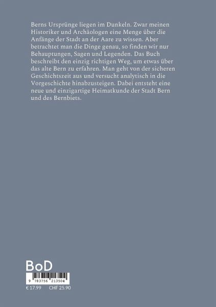 Berns Ursprünge liegen im Dunkeln. Zwar meinen Historiker und Archäologen eine Menge über die Anfänge der Stadt an der Aare zu wissen. Aber betrachtet man die Dinge genau, so finden wir nur Behauptungen, Sagen und Legenden. Das Buch beschreibt den einzig richtigen Weg, um etwas über das alte Bern zu erfahren. Man geht von der sicheren Geschichtszeit aus und versucht analytisch in die Vorgeschichte hinabzusteigen. Dabei entsteht eine neue und einzigartige Heimatkunde der Stadt Bern und des Bernbiets.