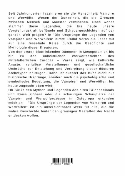 Seit Jahrhunderten faszinieren sie die Menschheit: Vampire und Werwölfe, Wesen der Dunkelheit, die die Grenzen zwischen Mensch und Monster verwischen. Doch woher stammen diese Legenden, die bis heute unsere Vorstellungskraft beflügeln und Schauergeschichten auf der ganzen Welt prägen? In "Die Ursprünge der Legenden von Vampiren und Werwölfen" nimmt Radul Varas die Leser mit auf eine fesselnde Reise durch die Geschichte und Mythologie dieser Kreaturen.Von den ersten bluttrinkenden Dämonen in Mesopotamien bis hin zu den unheimlichen Werwolfberichten des mittelalterlichen Europas - Varas zeigt, wie kulturelle Ängste, religiöse Vorstellungen und gesellschaftliche Umbrüche zur Entstehung und Verbreitung dieser düsteren Archetypen beitrugen. Dabei beleuchtet das Buch nicht nur historische Ursprünge, sondern auch die psychologische und symbolische Bedeutung, die Vampiren und Werwölfen bis heute zugeschrieben wird.Ob Sie in den Mythen und Legenden des alten Griechenlands und Roms stöbernoder die schaurigen Schauplätze der Vampir- und Werwolfprozesse in Osteuropa erkunden möchten - "Die Ursprünge der Legenden von Vampiren und Werwölfen" ist ein unverzichtbares Werk für alle, die die wahre Geschichte hinter den grausigen Gestalten der Nacht entdecken wollen.