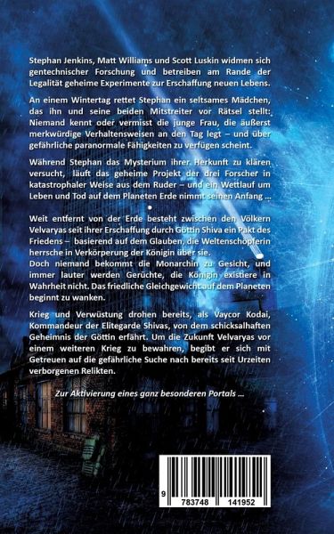 Stephan Jenkins, Matt Williams und Scott Luskin widmen sich gentechnischer Forschung und betreiben am Rande der Legalität geheime Experimente zur Erschaffung neuen Lebens. An einem Wintertag rettet Stephan ein seltsames Mädchen, das ihn und seine beiden Mitstreiter vor Rätsel stellt:Niemand kennt oder vermisst die junge Frau, die äußerst merkwürdige Verhaltensweisen an den Tag legt - und über gefährliche paranormale Fähigkeiten zu verfügen scheint. Während Stephan das Mysterium ihrer Herkunft zu klären versucht, läuft das geheime Projekt der drei Forscher in katastrophaler Weise aus dem Ruder - und ein Wettlauf um Leben und Tod auf dem Planeten Erde nimmt seinen Anfang...---Weit entfernt von der Erde besteht zwischen den Völkern Velvaryas seit ihrer Erschaffung durch Göttin Shiva ein Pakt des Friedens - basierend auf dem Glauben, die Weltenschöpferin herrsche in Verkörperung der Königin über sie. Doch niemand bekommt die Monarchin zu Gesicht, und immer lauter werden Gerüchte, die Königin existiere in Wahrheit nicht. Das friedliche Gleichgewicht auf dem Planeten beginnt zu wanken. Krieg und Verwüstung drohen bereits, als Vaycor Kodai, Kommandeur der Elitegarde Shivas, von dem schicksalhaften Geheimnis der Göttin erfährt. Um die Zukunft Velvaryas vor einem weiteren Krieg zu bewahren, begibt er sich mit Getreuen auf die gefährliche Suche nach bereits seit Urzeiten verborgenen Relikten. Zur Aktivierung eines ganz besonderen Portals...