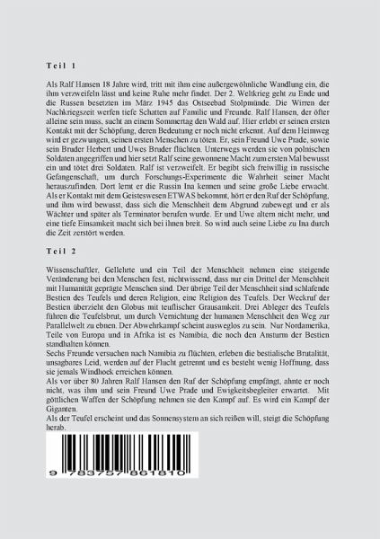 T e i l 1Als Ralf Hansen 18 Jahre wird, tritt mit ihm eine außergewöhnliche Wandlung ein, die ihm verzweifeln lässt und keine Ruhe mehr findet. Der 2. Weltkrieg geht zu Ende und die Russen besetzten im März 1945 das Ostseebad Stolpmünde. Die Wirren der Nachkriegszeit werfen tiefe Schatten auf Familie und Freunde. Ralf Hansen, der öfter alleine sein muss, sucht an einem Sommertag den Wald auf. Hier erlebt er seinen ersten Kontakt mit der Schöpfung, deren Bedeutung er noch nicht erkennt. Auf dem Heimweg wird er gezwungen, seinen ersten Menschen zu töten. Er, sein Freund Uwe Prade, sowie sein Bruder Herbert und Uwes Bruder flüchten. Unterwegs werden sie von polnischen Soldaten angegriffen und hier setzt Ralf seine gewonnene Macht zum ersten Mal bewusst ein und tötet drei Soldaten. Ralf ist verzweifelt. Er begibt sich freiwillig in russische Gefangenschaft, um durch Forschungs-Experimente die Wahrheit seiner Macht herauszufinden. Dort lernt er die Russin Ina kennen und seine große Liebe erwacht.Als er Kontakt mit dem Geisteswesen ETWAS bekommt, hört er den Ruf der Schöpfung, und ihm wird bewusst, dass sich die Menschheit dem Abgrund zubewegt und er als Wächter und später als Terminator berufen wurde. Er und Uwe altern nicht mehr, und eine tiefe Einsamkeit macht sich bei ihnen breit. So wird auch seine Liebe zu Ina durch die Zeit zerstört werden. T e i l 2Wissenschaftler, Gellehrte und ein Teil der Menschheit nehmen eine steigende Veränderung bei den Menschen fest, nichtwissend, dass nur ein Drittel der Menschheit mit Humanität geprägte Menschen sind. Der übrige Teil der Menschheit sind schlafende Bestien des Teufels und deren Religion, eine Religion des Teufels. Der Weckruf der Bestien überzieht den Globus mit teuflischer Grausamkeit. Drei Ableger des Teufels führen die Teufelsbrut, um durch Vernichtung der humanen Menschheit den Weg zur Parallelwelt zu ebnen. Der Abwehrkampf scheint ausweglos zu sein. Nur Nordamerika, Teile von Europa und in Afrika ist es Namibia, die noch den Ansturm der Bestien standhalten können. Sechs Freunde versuchen nach Namibia zu flüchten, erleben die bestialische Brutalität, unsagbares Leid, werden auf der Flucht getrennt und es besteht wenig Hoffnung, dass sie jemals Windhoek erreichen können. Als vor über 80 Jahren Ralf Hansen den Ruf der Schöpfung empfängt, ahnte er noch nicht, was ihm und sein Freund Uwe Prade und Ewigkeitsbegleiter erwartet. Mit göttlichen Waffen der Schöpfung nehmen sie den Kampf auf. Es wird e