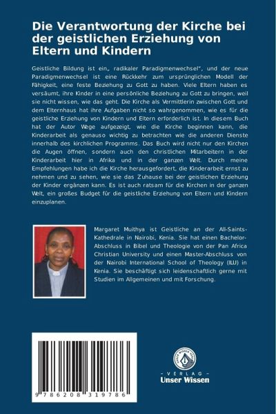 Geistliche Bildung ist ein" radikaler Paradigmenwechsel", und der neue Paradigmenwechsel ist eine Rückkehr zum ursprünglichen Modell der Fähigkeit, eine feste Beziehung zu Gott zu haben. Viele Eltern haben es versäumt, ihre Kinder in eine persönliche Beziehung zu Gott zu bringen, weil sie nicht wissen, wie das geht. Die Kirche als Vermittlerin zwischen Gott und dem Elternhaus hat ihre Aufgaben nicht so wahrgenommen, wie es für die geistliche Erziehung von Kindern und Eltern erforderlich ist. In diesem Buch hat der Autor Wege aufgezeigt, wie die Kirche beginnen kann, die Kinderarbeit als genauso wichtig zu betrachten wie die anderen Dienste innerhalb des kirchlichen Programms. Das Buch wird nicht nur den Kirchen die Augen öffnen, sondern auch den christlichen Mitarbeitern in der Kinderarbeit hier in Afrika und in der ganzen Welt. Durch meine Empfehlungen habe ich die Kirche herausgefordert, die Kinderarbeit ernst zu nehmen und zu sehen, wie sie das Zuhause bei der geistlichen Erziehung der Kinder ergänzen kann. Es ist auch ratsam für die Kirchen in der ganzen Welt, ein großes Budget für die geistliche Erziehung von Eltern und Kindern einzuplanen.
