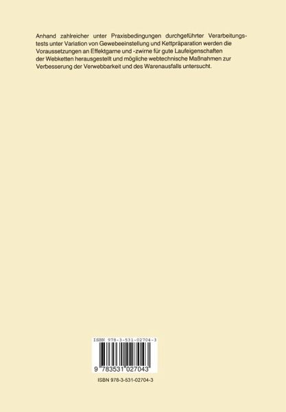 Die Mode verlangt immer wieder fur Heimtextilien- und Beklei dungsgewebe eine vielseitige und abwechslungsreiche Gestaltung. Diese wird durch das Zusammenspiel von Garnmaterial und -struk tur, Farbe und Bindungstechnik erreicht. Garne oder Zwirne, die in einem Gewebe eine besondere optische Wirkung oder Struktur erzeugen, werden unter dem Sammelbegriff Effektgarne zusammen gefaBt. Sie konnen auf unterschiedliche Weise in allen mogli chen Abarten und Varianten hergestellt werden. Allen Effekt garnen gemeinsam ist durchweg eine groBe UngleichmaBigkeit im Garnquerschnitt eigen, die zu Verarbeitungsschwierigkeiten in der Weberei fuhren kann, insbesondere wenn die Garne als Ket te eingesetzt werden. Oft sind die Effekte im Garnverband nicht genugend verankert, die Garnverdickungen schieben sich an Kettfadenwachterlamellen, Webelitzen und im Bereich des Webeblattes wahrend des Webevorganges auf und die absteh- den Fasern hindern den WebprozeB. Solche Garne lassen sich ei gentlich nur in SchuBrichtung verarbeiten. Da aber der Wunsch besteht, Effekte in beiden Geweberichtungen zu haben, werden die Garne meist unter erheblichen Schwierigkeiten ebenfalls als Kette eingesetzt. Dies geschieht zum Teil auch, weil die Voraussetzungen fur eine ausreichende Vorausbeurteilung der Verarbeitbarkeit fehlen. Die vorliegende Ausarbeitung hat daher folgende Ziele: 1) Die Anforder~ngen zu ermitteln, die an ein Effekt garn im Hinblick auf eine befriedigende Verarbeit barkeit als Kettgarn gestellt werden mussen. 2) Die Grundlagen fur eine Vorausbeurteilung der Ver arbeitbarkeit durch entsprechende Vorprlifungen der Garne zu schaffen. 3) Die Moglichkeiten zu untersuchen, die in der Webe reivorbereitung, in der Schlichterei und in der Weberei bestehen, die Verarbeitung von Effektgar nen in der Kette zu verbessern.