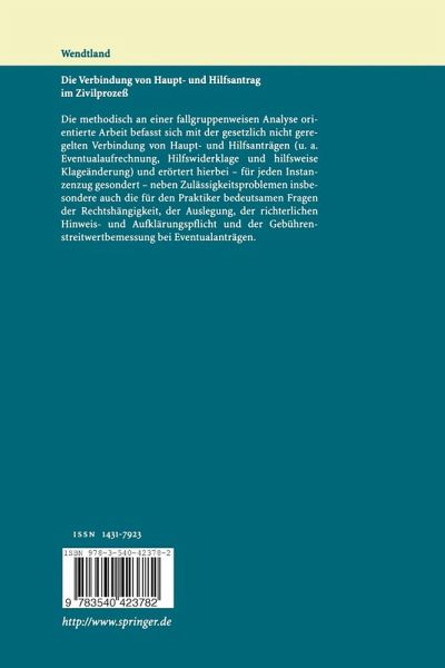 A. Einleitung.- B. Haupt- und Hilfsantrag im allgemeinen.- I. Streitgegenstand.- II. Unterscheidung von Haupt- und Hilfsantrag.- III. Haupt- und Hilfsantrag des Klägers.- IV. Haupt- und Hilfsantrag des Beklagten.- C. Zulässigkeit von Hilfsanträgen.- I. Allgemeine Zulässigkeit bedingter Prozeßhandlungen.- II. Zulässigkeitsvoraussetzungen für Hilfsanträge des Klägers.- III. Zulässigkeitsvoraussetzungen für Hilfsantrage des Beklagten.- D. Verbioduog von Haupt- uod Hilfsantrag in der ersten Instanz.- I. Rechtshängigkeit.- II. Verfahren.- III. Erstinstanzliche Entscheidungen.- IV. Streitwert und Kostenentscheidung.- E. Anfallwirkung von Haupt- und Hilfsantrag in der Berufung.- I. Allgemeines.- II. Berufung des Klägers.- III. Berufung des Beklagten.- IV. Eventualanschlußberufung.- V. Streitwert und Kostenentscheidung.- F. Besonderbeiten bei der Verbindung von Hauptund Hilfsantrag in der Revision.- I. Allgemeines.- II. Revision des Klägers.- III. Revision des Beklagten.- Zusammenfassung.