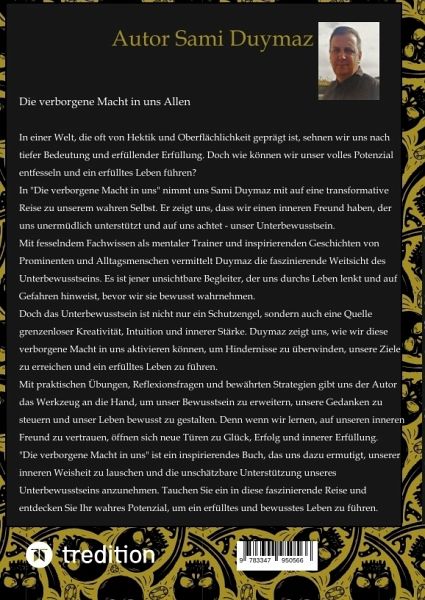 Titel: "Die verborgene Macht in uns: Entdecke dein inneres Potenzial"Rückseite:In einer Welt, die oft von Hektik und Oberflächlichkeit geprägt ist, sehnen wir uns nach tiefer Bedeutung und erfüllender Erfüllung. Doch wie können wir unser volles Potenzial entfesseln und ein erfülltes Leben führen?In "Die verborgene Macht in uns" nimmt uns Sami Duymaz mit auf eine transformative Reise zu unserem wahren Selbst. Er zeigt uns, dass wir einen inneren Freund haben, der uns unermüdlich unterstützt und auf uns achtet - unser Unterbewusstsein.Mit fesselndem Fachwissen als mentaler Trainer und inspirierenden Geschichten von Prominenten und Alltagsmenschen vermittelt Duymaz die faszinierende Weitsicht des Unterbewusstseins. Es ist jener unsichtbare Begleiter, der uns durchs Leben lenkt und auf Gefahren hinweist, bevor wir sie bewusst wahrnehmen.Doch das Unterbewusstsein ist nicht nur ein Schutzengel, sondern auch eine Quelle grenzenloser Kreativität, Intuition und innerer Stärke. Duymaz zeigt uns, wie wir diese verborgene Macht in uns aktivieren können, um Hindernisse zu überwinden, unsere Ziele zu erreichen und ein erfülltes Leben zu führen.Mit praktischen Übungen, Reflexion fragen und bewährten Strategien gibt uns der Autor das Werkzeug an die Hand, um unser Bewusstsein zu erweitern, unsere Gedanken zu steuern und unser Leben bewusst zu gestalten. Denn wenn wir lernen, auf unseren inneren Freund zu vertrauen, öffnen sich neue Türen zu Glück, Erfolg und innerer Erfüllung."Die verborgene Macht in uns" ist ein inspirierendes Buch, das uns dazu ermutigt, unserer inneren Weisheit zu lauschen und die unschätzbare Unterstützung unseres Unterbewusstseins anzunehmen. Tauchen Sie ein in diese faszinierende Reise und entdecken Sie Ihr wahres Potenzial, um ein erfülltes und bewusstes Leben zu führen.