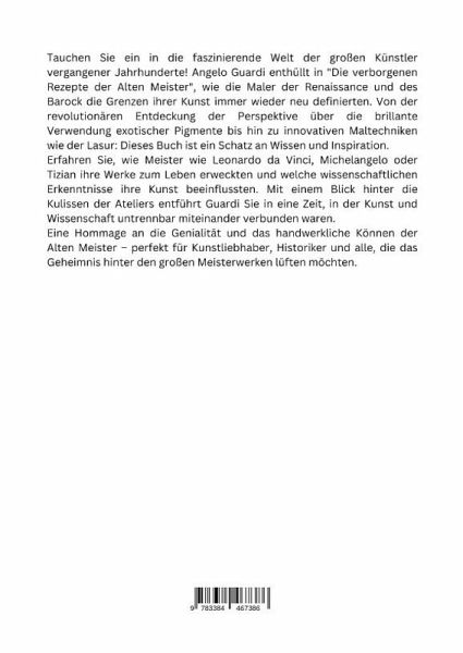 Tauchen Sie ein in die faszinierende Welt der großen Künstler vergangener Jahrhunderte! Angelo Guardi enthüllt in "Die verborgenen Rezepte der Alten Meister", wie die Maler der Renaissance und des Barock die Grenzen ihrer Kunst immer wieder neu definierten. Von der revolutionären Entdeckung der Perspektive über die brillante Verwendung exotischer Pigmente bis hin zu innovativen Maltechniken wie der Lasur: Dieses Buch ist ein Schatz an Wissen und Inspiration.Erfahren Sie, wie Meister wie Leonardo da Vinci, Michelangelo oder Tizian ihre Werke zum Leben erweckten und welche wissenschaftlichen Erkenntnisse ihre Kunst beeinflussten. Mit einem Blick hinter die Kulissen der Ateliers entführt Guardi Sie in eine Zeit, in der Kunst und Wissenschaft untrennbar miteinander verbunden waren.Eine Hommage an die Genialität und das handwerkliche Können der Alten Meister - per-fekt für Kunstliebhaber, Historiker und alle, die das Geheimnis hinter den großen Meisterwerken lüften möchten.