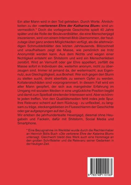 Ein alter Mann wird in den Tod getrieben. Durch Worte. Ähnlichkeiten zu der »verlorenen Ehre der Katharina Blum« sind unvermeidlich._ Doch die vorliegende Geschichte spielt 40 Jahre später und die Rolle der Boulevardblätter, die eine Menschenjagd inszenieren, wird von einem Internet-Mob übernommen, der heutzutage über ganz andere Möglichkeiten verfügt, als die altehrwürdigen Schmuddelblätter des letzten Jahrtausends. Blitzschnell und unaufhaltsam zeigt die Masse, wie persönlich sie trotz Anonymität werden kann. Aus dem Nichts und wegen einer Nichtigkeit entsteht ein Shitstorm und wird ein Menschenleben zerstört. Wird an Vernunft oder gar Ehre appelliert, zerfällt die Masse sofort in Individuen die, weiterhin anonym, nicht zu überzeugen sind. Immer ist jemand da, der weitermacht; aus Eigennutz, aus Gleichgültigkeit, aus Bosheit. Wer sich gegen den Sturm zu stellen sucht, droht ebenfalls zu seinem Opfer zu werden. Kollateralschäden sind vorprogrammiert. In diesem Fall wird ein alter Mann geopfert, der sich aus mangelnder Erfahrung im Umgang mit sozialen Medien in eine unglückliche Position begibt und damit zum Spielball streitender Interessen wird. Aber es könnte jeden treffen. Von den Qualitätsmedien fehlt indes jede Spur. Ihre Relevanz scheint auf dem Rückzug - zu unflexibel, zu langsam zu träge, steckengeblieben im Flussschlamm der Geschichte oder gar aufgesprungen auf den Zug. Wir erleben die jahrhundertealte Hexenjagd, diesmal ohne Heugabeln und Fackeln, dafür mit Shitstorm, Social Media und Smartphone. --- _ Eine Bezugnahme im Werktitel wurde durch die Rechteinhaber an Heinrich Bölls Buch »Die verlorene Ehre der Katarina Blum« untersagt. Gleichwohl bleibt dies Werk auch eine Hommage an den großen Schriftsteller und die Relevanz seiner Gedanken in der heutigen Zeit.