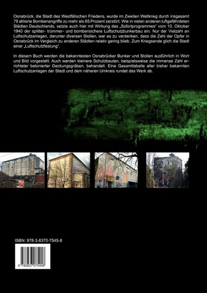 Osnabrück, die Stadt des Westfälischen Friedens, wurde im Zweiten Weltkrieg durch insgesamt 79 alliierte Bombenangriffe zu mehr als 65 Prozent zerstört. Wie in vielen anderen luftgefährdeten Städten Deutschlands, setzte auch hier mit Wirkung des "Sofortprogrammes" vom 10. Oktober 1940 der splitter- trümmer- und bombensichere Luftschutzbunkerbau ein. Nur der Vielzahl an Luftschutzanlagen, darunter diversen Stollen, war es zu verdanken, dass die Zahl der Opfer in Osnabrück im Vergleich zu anderen Städten relativ gering blieb. Zum Kriegsende glich die Stadt einer "Luftschutzfestung". In diesem Buch werden die bekanntesten Osnabrücker Bunker und Stollen ausführlich in Wort und Bild vorgestellt. Auch werden kleinere Schutzbauten, beispielsweise die immense Zahl errichteter betonierter Deckungsgräben, behandelt. Eine Gesamttabelle aller bisher bekannten Luftschutzanlagen der Stadt und dem näheren Umkreis rundet das Werk ab.