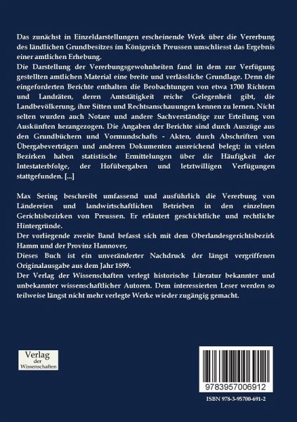 Max Sering beschreibt umfassend und ausführlich die Vererbung von Ländereien und landwirtschaftlichen Betrieben in den einzelnen Gerichtsbezirken von Preussen. Er erläutert geschichtliche und rechtliche Hintergründe.