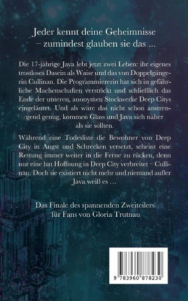Jeder kennt deine Geheimnisse - zumindest glauben sie das ...Das Finale des spannenden Zweiteilers für Fans von Gloria TrutnauDie 17-jährige Java lebt jetzt zwei Leben: ihr eigenes trostloses Dasein als Waise und das von Doppelgängerin Cullinan. Die Programmiererin hat sich in gefährliche Machenschaften verstrickt und schließlich das Ende der unteren, anonymen Stockwerke Deep Citys eingeläutet. Und als wäre das nicht schon anstrengend genug, kommen Glass und Java sich näher als sie sollten.Während eine Todesliste die Bewohner von Deep City in Angst und Schrecken versetzt, scheint eine Rettung immer weiter in die Ferne zu rücken, denn nur eine hat Hoffnung in Deep City verbreitet - Cullinan. Doch sie existiert nicht mehr und niemand außer Java weiß es ...Erste Leserstimmen"endlich konnte ich den Abschluss lesen, ich hab die Warterei kaum ertragen""Emily Dunwood schreibt unglaublich fesselnd""die Spannung ist unfassbar, ich musste den Roman in einem Rutsch lesen""Wieder lässt uns Emily Dunwood in eine Welt blicken, die unserer gar nicht fern ist und legt dabei so viel Geschick an den Tag, dass ich dieses Buch jedem meiner Freunde empfehlen werde!"Weitere Titel dieser ReiheDie gefallene Stadt (ISBN: 9783960877356)
