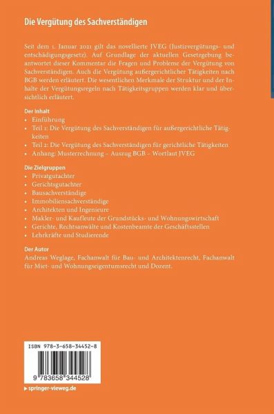Seit dem 1. Januar 2021 gilt das novellierte JVEG (Justizvergütungs - und entschädigungsgesetz). Auf Grundlage der aktuellen Gesetzgebung beantwortet dieser Kommentar die Fragen und Probleme der Vergütung von Sachverständigen. Auch die Vergütung außergerichtlicher Tätigkeiten nach BGB werden erläutert. Die wesentlichen Merkmale der Struktur und der Inhalte der Vergütungsregeln nach Tätigkeitsgruppen werden klar und übersichtlich erläutert.