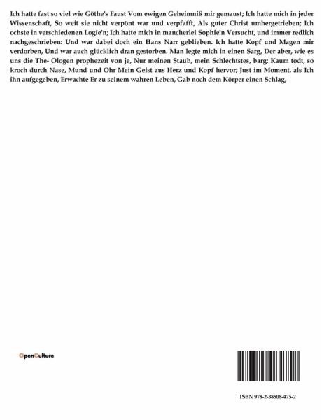 Ich hatte fast so viel wie Göthe's Faust Vom ewigen Geheimniß mir gemaust; Ich hatte mich in jeder Wissenschaft, So weit sie nicht verpönt war und verpfafft, Als guter Christ umhergetrieben; Ich ochste in verschiedenen Logie'n; Ich hatte mich in mancherlei Sophie'n Versucht, und immer redlich nachgeschrieben: Und war dabei doch ein Hans Narr geblieben. Ich hatte Kopf und Magen mir verdorben, Und war auch glücklich dran gestorben. Man legte mich in einen Sarg, Der aber, wie es uns die The- Ologen prophezeit von je, Nur meinen Staub, mein Schlechtstes, barg: Kaum todt, so kroch durch Nase, Mund und Ohr Mein Geist aus Herz und Kopf hervor; Just im Moment, als Ich ihn aufgegeben, Erwachte Er zu seinem wahren Leben, Gab noch dem Körper einen Schlag,