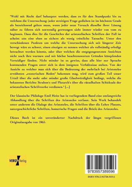 Der klassische Philologe Emil Heitz hat in vorliegendem Band eine umfangreiche Abhandlung über die Schriften des Aristoteles verfasst. Sein Werk behandelt unter anderem die Dialoge des Aristoteles, die Schriften über die Lehre Platons, naturgeschichtliche Schriften, homerische Fragen und die Briefe des Aristoteles.