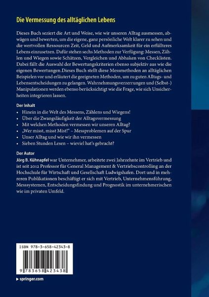 Dieses Buch seziert die Art und Weise, wie wir unseren Alltag ausmessen, abwägen und bewerten, um die eigene, ganz persönliche Welt klarer zu sehen und die wertvollen Ressourcen Zeit, Geld und Aufmerksamkeit für ein erfüllteres Lebens einzusetzen. Dafür stehen sechs Methoden zur Verfügung: Messen, Zählen und Wiegen sowie Schätzen, Vergleichen und Abhaken von Checklisten. Dabei fällt die Auswahl der Bewertungskriterien ebenso subjektiv aus wie die eigenen Bewertungen.Dieses Buch stellt diese Messmethoden an alltäglichen Beispielen vor und erläutert die geeigneten Methoden, um zu guten Alltags- und Lebensentscheidungen zu gelangen. Wahrnehmungsverzerrungen und (Selbst-) Manipulationen werden ebenso berücksichtigt wie die Frage, wie sich Unsicherheiten integrieren lassen.