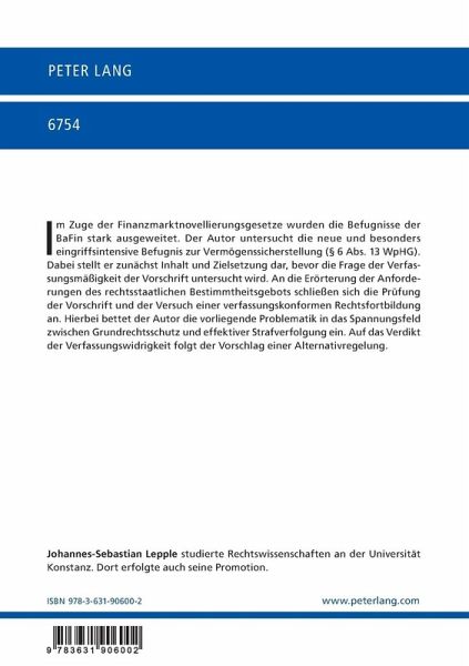 Im Zuge der Finanzmarktnovellierungsgesetze wurden die Befugnisse der BaFin stark ausgeweitet. Der Autor untersucht die neue und besonders eingriffsintensive Befugnis zur Vermögenssicherstellung (§ 6 Abs. 13 WpHG). Dabei stellt er zunächst Inhalt und Zielsetzung dar, bevor die Frage der Verfassungsmäßigkeit der Vorschrift untersucht wird. An die Erörterung der Anforderungen des rechtsstaatlichen Bestimmtheitsgebots schließen sich die Prüfung der Vorschrift und der Versuch einer verfassungskonformen Rechtsfortbildung an. Hierbei bettet der Autor die vorliegende Problematik in das Spannungsfeld zwischen Grundrechtsschutz und effektiver Strafverfolgung ein. Auf das Verdikt der Verfassungswidrigkeit folgt der Vorschlag einer Alternativregelung.