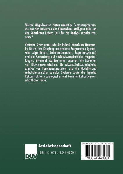 Welche Möglichkeiten bieten neuartige Computerprogramme aus den Bereichen der Künstlichen Intelligenz (KI) und des Künstlichen Lebens (KL) für die Analyse sozialer Prozesse? Christina Stoica untersucht die Technik Künstlicher Neuronaler Netze, ihre Kopplung mit anderen Programmen (genetische Algorithmen, Zellularautomaten, Expertensysteme) und die Anwendung auf sozialwissenschaftliche Fragestellungen. Behandelt werden unter anderem die Evolution von Klassengesellschaften, die wissenschaftssoziologische Analyse von Forschungsprozessen und die Modellierung selbstrefenzieller sozialer Systeme sowie die logische Rekonstruktion soziologischer und kommunikationswissenschaftlicher Texte.
