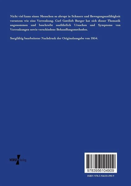 Nicht viel kann einen Menschen so abrupt in Schmerz und Bewegungsunfähigkeit versetzen wie eine Verrenkung. Carl Gottlieb Burger hat sich dieser Thematik angenommen und beschreibt ausführlich Ursachen und Symptome von Verrenkungen sowie verschiedene Behandlungsmethoden. Sorgfältig bearbeiteter Nachdruck der Originalausgabe von 1854.