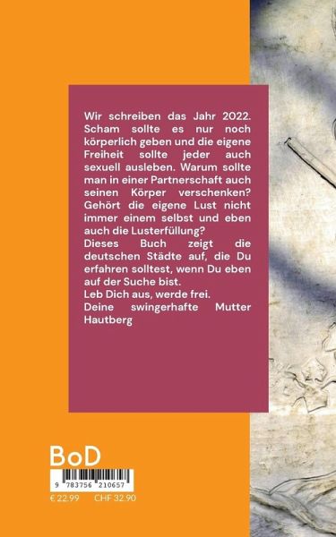 Wir schreiben das Jahr 2022. Scham sollte es nur noch körperlich geben und die eigene Freiheit sollte jeder auch sexuell ausleben. Warum sollte man in einer Partnerschaft auch seinen Körper verschenken? Gehört die eigene Lust nicht immer einem selbst und eben auch die Lusterfüllung? Dieses Buch zeigt die deutschen Städte auf, die Du erfahren solltest, wenn Du eben auf der Suche bist. Leb Dich aus, werde frei. Deine swingerhafte Mutter Hautberg