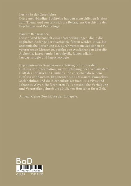 Irrsinn in der GeschichteDiese mehrbändige Buchreihe hat den menschlichen Irrsinn zum Thema und versteht sich als Beitrag zur Geschichte der Psychiatrie und PsychologieBand 3: RenaissanceDieser Band behandelt einige Vorbedingungen, die in die zaghaften Anfänge der Psychiatrie führen werden. Etwa die anatomische Forschung u.a. durch verbotene Sektionen an verstorbenen Menschen, gefolgt von Ausführungen über die Alchemie, Iatrochemie, Iatrophysik, Iatromedizin, Iatroastrologie und Iatrotheologie.Exponenten der Renaissance arbeiten, teils unter dem Einfluss der Reformation, an der Befreiung der Irren aus dem Griff des christlichen Glaubens und entziehen diese dem Einfluss der Kirchen. Exponenten sind Descartes, Paracelsus, Melanchthon und die Kirchenkritiker Juan Luis Vives und Johannes Weyer. Sie fürchteten Teils persönliche Verfolgung und Verurteilung durch die göttlichen Herrscher ihrer Zeit.Annex: Kleine Geschichte der Epilepsie.