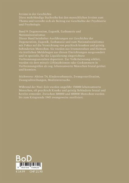 Irrsinn in der GeschichteDiese mehrbändige Buchreihe hat den menschlichen Irrsinn zum Thema und versteht sich als Beitrag zur Geschichte der Psychiatrie und Psychologie. Band 9: Degeneration, Eugenik, Euthanasie und Nationalsozialismus Dieser Band beinhaltet Ausführungen zur Geschichte der Degeneration, Eugenik, Euthanasie und zum Nationalsozialismus mit Fokus auf die Vernichtung von psychisch kranken und geistig behinderten Menschen. Sie wurden aus Irrenanstalten und Heimen via ärztlichen Meldebogen aus diesen Einrichtungen ausgesondert und in spezielle, für die Liquidierung eingerichtete Verbrennungsanstalten deportiert. Zur Volksbelastung erklärt, wurden sie dort mittels Giftinjektionen oder Gaskammern in Verbrennungsöfen als sog. lebensunwerte Menschen brutal getötet und kremiert. Stichworte: Aktion T4, Kindereuthanasie, Zwangssterilisation, Zwangsabtreibungen, Medizinversuche.Während der Nazi-Zeit wurden ungefähr 150000 lebensunwerte Menschen, oft psychisch Kranke und geistig Behinderte brutal und herzlos ermordet. Zwischen 300000 und 400000 Menschen wurden bis zum Kriegsende 1945 zwangsweise sterilisiert.