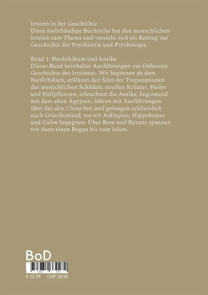 Irrsinn in der GeschichteDiese mehrbändige Buchreihe hat den menschlichen Irrsinn zum Thema und versteht sich als Beitrag zur Geschichte der Psychiatrie und Psychologie. Band 1: Neolithikum und AntikeDieser Band beinhaltet Ausführungen zur frühesten Geschichte des Irrsinnes. Wir beginnen ab dem Neolithikum, erklären den Sinn der Trepanationen des menschlichen Schädels, streifen Kräuter, Heiler und Heilpflanzen, erleuchten die Antike, beginnend mit dem alten Ägypten, fahren mit Ausführungen über das alte China fort und gelangen schliesslich nach Griechenland, wo wir Asklepios, Hippokrates und Galen begegnen. Über Rom und Byzanz spannen wir dann einen Bogen bis zum Islam.
