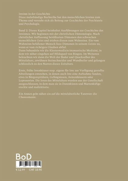Irrsinn in der GeschichteDiese mehrbändige Buchreihe hat den menschlichen Irrsinn zum Thema und versteht sich als Beitrag zur Geschichte der Psychiatrie und Psychologie. Band 2: Dieses Kapitel beinhaltet Ausführungen zur Geschichte des Irrsinnes. Wir beginnen mit der christlichen Dämonologie. Nach christlicher Auffassung bevölkerten Dämonen den schwachen menschlichen Geist und trieben diesen zum Wahnsinn. Ein vom Wahnsinn befallener Mensch liess Dämonen in seinem Geiste zu, wenn er vom richtigen Glauben abfiel.Dann behandeln wir die Klostermedizin (monastische Medizin), in dem wir näher eingehen auf Hildegard von Bingen. Im Weiteren beleuchten wir dann die Welt der Bader und Quacksalber des Mittelalters, erwähnen Steinschneider und Wundheiler und gelangen schliesslich zu den Narren dieses Zeitalters.Erste, frühe Irrenhäuser resp. eigens für Irre zur Verfügung gestellte Abteilungen entstehen, in denen auch Irre eine Aufnahme fanden, etwa in Bürgerspitälern, Gefängnissen, Armenhäusern oder Leprosorien. Die Irren des Mittelalters wurden aus der Gesellschaft ausgeschlossen, in dem man sie in Dorenkisten und Narrenkäfige steckte und malträtierte.Ein Annex geht näher ein auf die mittelalterliche Tanzwut: die Choreomanie.
