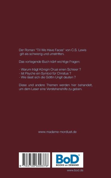 Der Roman "Till We Have Faces" von C.S. Lewis (dem Autor der "Chroniken von Narnia"), gilt als schwierig und umstritten. Das vorliegende Buch klärt wichtige Fragen: - Warum trägt Königin Orual einen Schleier ? - Ist Psyche ein Symbol für Christus ? - Wie lässt sich die Göttin Ungit deuten ? Diese und andere Themen werden hier behandelt, um dem Leser eine Verstehenshilfe zu geben.
