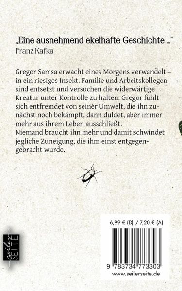 Gregor Samsa erwacht eines Morgens verwandelt - in ein riesiges Insekt. Familie und Arbeitskollegen sind entsetzt und versuchen die widerwärtige Kreatur unter Kontrolle zu halten."Als Gregor Samsa eines Morgens aus unruhigen Träumen erwachte, fand er sich in seinem Bett zu einem ungeheueren Ungeziefer verwandelt. Er lag auf seinem panzerartig harten Rücken und sah, wenn er den Kopf ein wenig hob, seinen gewölbten, braunen, von bogenförmigen Versteifungen geteilten Bauch ..."