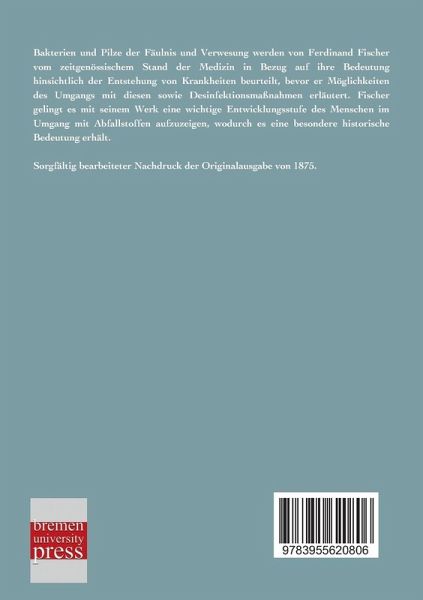 Bakterien und Pilze der Fäulnis und Verwesung werden von Ferdinand Fischer vom zeitgenössischem Stand der Medizin in Bezug auf ihre Bedeutung hinsichtlich der Entstehung von Krankheiten beurteilt, bevor er Möglichkeiten des Umgangs mit diesen sowie Desinfektionsmaßnahmen erläutert. Fischer gelingt es mit seinem Werk eine wichtige Entwicklungsstufe des Menschen im Umgang mit Abfallstoffen aufzuzeigen, wodurch es eine besondere historische Bedeutung erhält.
