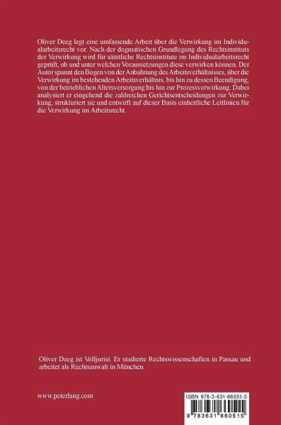 Oliver Deeg legt eine umfassende Arbeit über die Verwirkung im Individualarbeitsrecht vor. Nach der dogmatischen Grundlegung des Rechtsinstituts der Verwirkung wird für sämtliche Rechtsinstitute im Individualarbeitsrecht geprüft, ob und unter welchen Voraussetzungen diese verwirken können. Der Autor spannt den Bogen von der Anbahnung des Arbeitsverhältnisses, über die Verwirkung im bestehenden Arbeitsverhältnis, bis hin zu dessen Beendigung, von der betrieblichen Altersversorgung bis hin zur Prozessverwirkung. Dabei analysiert er eingehend die zahlreichen Gerichtsentscheidungen zur Verwirkung, strukturiert sie und entwirft auf dieser Basis einheitliche Leitlinien für die Verwirkung im Arbeitsrecht.