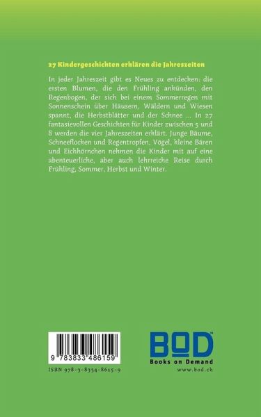 27 Kindergeschichten erklären die JahreszeitenIn jeder Jahreszeit gibt es Neues zu entdecken: die ersten Blumen, die den Frühling ankünden, den Regenbogen, der sich bei einem Sommerregen mit Sonnenschein über Häusern, Wäldern und Wiesen spannt, die Herbstblätter und der Schnee ... In 27 fantasievollen Geschichten für Kinder zwischen 5 und 8 werden die vier Jahreszeiten erklärt. Junge Bäume, Schneeflocken und Regentropfen, Vögel, kleine Bären und Eichhörnchen nehmen die Kinder mit auf eine abenteuerliche, aber auch lehrreiche Reise durch Frühling, Sommer, Herbst und Winter.