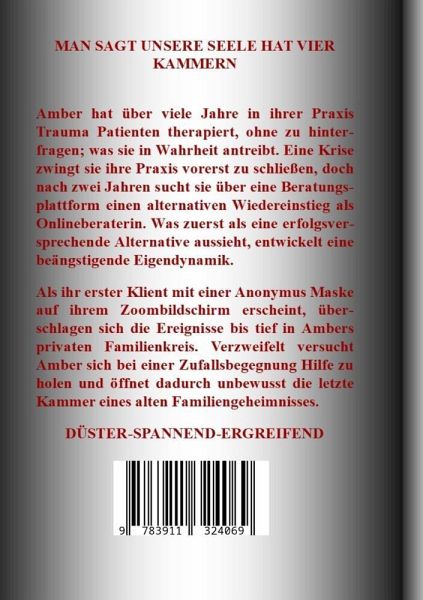 Amber arbeitet seit Jahren erfolgreich als Psychologin, mit dem Schwerpunkt "Traumatherapie". Während ihrer Praxiszeit hinterfragte sie nie, was sie wirklich dazu antrieb in die Tiefe seelischer Wunden vorzudringen. Als Corona ausbrach, entschied sich Amber gegen eine Impfung und musste ihren Therapieraum in einer Praxen Gemeinschaft auflösen. Ein halbes Jahr vor Beendigung der Einrichtungsbezogenen Impfpflicht, entscheidet sie ihren Neustart als ehrenamtliche Beraterin bei psychischen Krisen, einleitend voranzustellen, bevor sie wieder in einer eigenen Praxis arbeiten würde. Die befremdliche Vorstellung, beraterisch über Zoom zu arbeiten, wurde durch eine Bekannte die bereits länger als Coaching Beraterin erste Erfahrungen machen konnte, schnell verworfen. Doch bereits der erste Klient würde im Live- Chat den Beweis erbringen, dass die räumliche Distanz kein Sicherheitsgarant ist. Was zu Beginn ein scheinbar guter Plan war, entwickelt sich in eine düstere und gefährliche Ebene, in welcher der Unbekannte nicht nur tief in Ambers Privatsphäre eindringt, sondern auch unkalkulierbare Folgen für ihre ganze Familie zur Folge hat.
