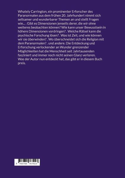 Whately Carrington, ein prominenter Erforscher des Paranormalen aus dem frühen 20. Jahrhundert nimmt sich seltsamer und wunderbarer Themen an und stellt Fragen wie... . Gibt es Dimensionen jenseits derer, die wir ohne weiteres beobachten können? Wie kann unser Bewusstsein in höhere Dimensionen vordringen? . Welche Rätsel kann die psychische Forschung lösen? . Was ist Zeit, und wie können wir sie überwinden? . Wo überschneidet sich die Religion mit dem Paranormalen? . und andere. Die Entdeckung und Erforschung verlockender an Wunder grenzender Möglichkeiten hat die Menschheit seit Jahrtausenden fasziniert und immer noch nicht seinen Glanz verloren. Was der Autor nun entdeckt hat, das gibt er in diesem Buch preis.