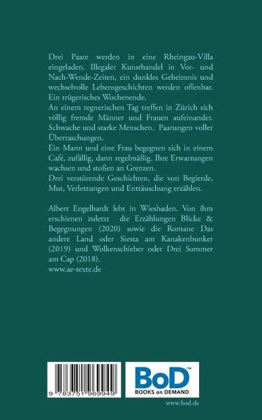 Drei Paare werden in eine Rheingau-Villa eingeladen. Illegaler Kunsthandel in Vor- und Nach-Wende-Zeiten, ein dunkles Geheimnis und wechselvolle Lebensgeschichten werden offenbar. Dazu ein Nachher, das nicht vorauszusehen war.An einem regnerischen Tag treffen in Zürich sich bis dahin wildfremde Männer und Frauen aufeinander. Schwache und starke. Paarungen voller Überraschungen.Ein Mann und eine Frau begegnen sich in einem Café, zufällig, dann regelmäßig. Ihre Erwartungen werden auf die Probe gestellt, Grenzen werden erkundet. Drei Geschichten, die von Zufällen, Begierde, Mut und Enttäuschung erzählen.