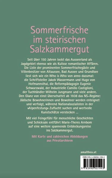 SOMMERFRISCHE IM STEIRISCHEN SALZKAMMERGUT Seit über 150 Jahren lockt das Ausseerland als Jagdgebiet ebenso wie als Kulisse romantischer Affären. Die Liste der prominenten Sommerfrischegäste und Villenbesitzer von Altaussee, Bad Aussee und Grundlsee liest sich wie ein Who is Who von anno dazumal: die Schriftsteller Jakob Wassermann und Hugo von Hofmannsthal, die Reformpädagogin Eugenie Schwarzwald, der Industrielle Camillo Castiglioni, der Tuchhändler Wilhelm Jungmann und viele andere. Den Glanz von einst überschattet ab 1938 das NS-Regime: Jüdische Bewohnerinnen und Bewohner werden enteignet und verfolgt, während Nationalsozialisten in der »Alpenfestung« Zuflucht suchen und wertvolle Kunstschätze verstecken ... Mit viel Feingefühl für menschliche Geschichten und Schicksale entführt Marie-Theres Arnbom auf eine weitere spannende Entdeckungsreise ins Salzkammergut.
