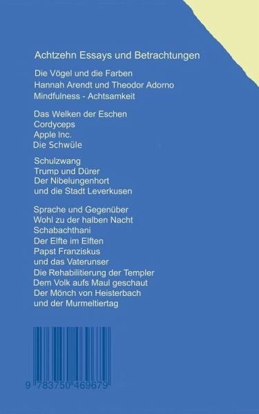 Der Text beschäftigt sich mit dem Wesen der Farben, etwa ihrer Neigung, sich zu gruppieren, und geht in diesem Zusammenhang auf die Fragwürdigkeit der von Immanuel Kant ausgehenden naturwissenschaftlichen Definition der Farbe als elektromagnetische Wellenlänge sowie der damit verbundenen Erkenntnislehre ein.Achtzehn Essays und Betrachtungen:Die Vögel und die FarbenHannah Arendt und Theodor AdornoMindfulness AchtsamkeitDas Welken der EschenCordycepsApple Inc.Die SchwüleSchulzwang Trump und DürerDer Nibelungenhort und die Stadt LeverkusenSprache und GegenüberWohl zu der halben NachtSchachthaniDer Elfte im ElftenDie Rehabilitierung der TemplerDem Volk aufs Maul geschautPapst Franziskus und das VaterunserDer Mönch von Heisterbach und der Murmeltier-Tag