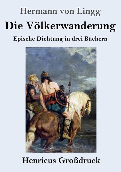 Hermann von Lingg: Die Völkerwanderung. Epische Dichtung in drei Büchern Lesefreundlicher Großdruck in 16-pt-Schrift Großformat, 210 x 297 mm Berliner Ausgabe, 2019 Durchgesehener Neusatz bearbeitet und eingerichtet von Theodor Borken Erstdruck: Stuttgart, Cotta, 1866-1868. Inhaltsverzeichnis: Die Völkerwanderung. Prolog. Erstes Buch. Erster Gesang: Die Goten an der Donau. Zweiter Gesang: Das Abendland. Dritter Gesang: Götterdämmerung. Vierter Gesang: Audogar und Sigune. Fünfter Gesang: Die griechische Insel. Sechster Gesang: Das Opfer. Siebenter Gesang: Alarich und Stelico. Achter Gesang: Die roten Ostern. Neunter Gesang: Eroberung Roms. Zehnter Gesang: Athaulf und Placidia. Zweites Buch. Erster Gesang: Die Vandalen. Zweiter Gesang: König Geiserich. Dritter Gesang: Die Gottesgeißel. Vierter Gesang: Die Hunnenschlacht. Fünfter Gesang: Maximus und Eudoxia. Sechster Gesang: Odoaker. Siebenter Gesang: Odoaker und Theodorich. Drittes Buch. Erster Gesang: Klodwig und die Franken. Zweiter Gesang: Ein goldenes Zeitalter. Dritter Gesang: Die Eiche von Ravenna. Vierter Gesang: Der Seekönig. Fünfter Gesang: Untergang des Vandalenreiches. Sechster Gesang: Die letzten Goten. Siebenter Gesang: Alboin und Rosamunde. Umschlaggestaltung von Thomas Schultz-Overhage unter Verwendung des Bildes: Evariste-Vital Luminais, Goten queren den Fluss, um 1880. Gesetzt aus der Minion Pro, 16 pt.