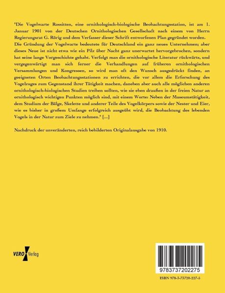 "Die Vogelwarte Rossitten, eine ornithologisch-biologische Beobachtungsstation, ist am 1. Januar 1901 von der Deutschen Ornithologischen Gesellschaft nach einem von Herrn Regierungsrat G. Rörig und dem Verfasser dieser Schrift entworfenen Plan gegründet worden.