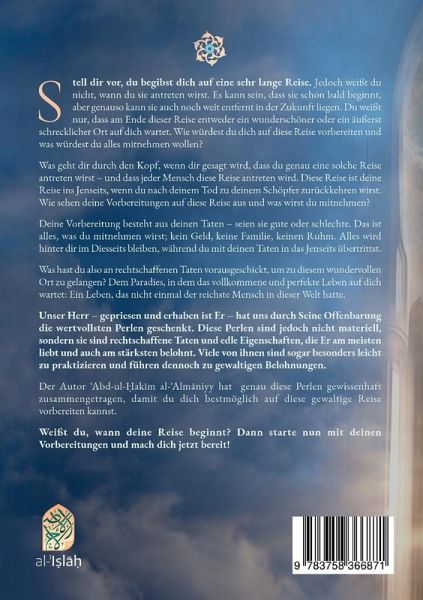 Stell dir vor, du begibst dich auf eine lange Reise ins Jenseits.Du weißt nicht, wann sie beginnt, aber am Ende erwartet dich entweder das Paradies oder eine schreckliche Bestimmung. Deine Vorbereitung besteht aus deinen Taten: gut oder schlecht. Geld, Familie, Ruhm werden zurückgelassen; nur deine Taten begleiten dich. Welche guten Taten hast du vorausgeschickt für das Paradies? Unser Herr hat uns durch Offenbarung wertvolle Perlen geschenkt - rechtschaffene Taten und edle Eigenschaften, die Er am meisten liebt und am stärksten belohnt. Autor Abd-ul-Hakim Al-Almani hat diese Perlen gesammelt, um uns auf diese Reise vorzubereiten. Weißt du, wann deine Reise beginnt? Starte jetzt mit deinen Vorbereitungen!