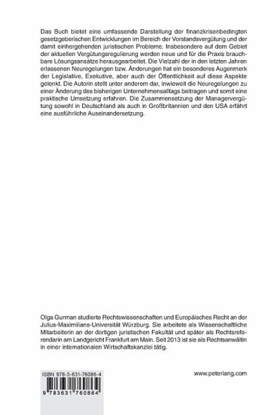 Das Buch bietet eine umfassende Darstellung der finanzkrisenbedingten gesetzgeberischen Entwicklungen im Bereich der Vorstandsvergütung und der damit einhergehenden juristischen Probleme. Insbesondere auf dem Gebiet der aktuellen Vergütungsregulierung werden neue und für die Praxis brauchbare Lösungsansätze herausgearbeitet. Die Vielzahl der in den letzten Jahren erlassenen Neuregelungen bzw. Änderungen hat ein besonderes Augenmerk der Legislative, Exekutive, aber auch der Öffentlichkeit auf diese Aspekte gelenkt. Die Autorin stellt unter anderem dar, inwieweit die Neuregelungen zu einer Änderung des bisherigen Unternehmensalltags beitragen und somit eine praktische Umsetzung erfahren. Die Zusammensetzung der Managervergütung sowohl in Deutschland als auch in Großbritannien und den USA erfährt eine ausführliche Auseinandersetzung.
