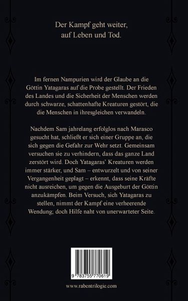 Der Kampf geht weiter, auf Leben und Tod.Im fernen Nampurien wird der Glaube an die Göttin Yatagaras auf die Probe gestellt. Der Frieden des Landes und die Sicherheit der Menschen werden durch schwarze, schattenhafte Kreaturen gestört, die die Menschen in ihresgleichen verwandeln. Nachdem Sam jahrelang erfolglos nach Marasco gesucht hat, schliesst er sich einer Gruppe an, die sich gegen die Gefahr zur Wehr setzt. Gemeinsam versuchen sie zu verhindern, dass das ganze Land zerstört wird. Doch Yatagaras' Kreaturen werden immer stärker, und Sam - entwurzelt und von seiner Vergangenheit geplagt - erkennt, dass seine Kräfte nicht ausreichen, um gegen die Ausgeburt der Göttin anzukämpfen. Beim Versuch, sich Yatagaras zu stellen, nimmt der Kampf eine verheerende Wendung; doch Hilfe naht von unerwarteter Seite.Ein fesselndes Fantasyepos für Erwachsene und alle, die Raben, Seher, Schwertkämpfer und Magier lieben.Die Wächter der Wüste ist der zweite Teil der Raben Trilogie.